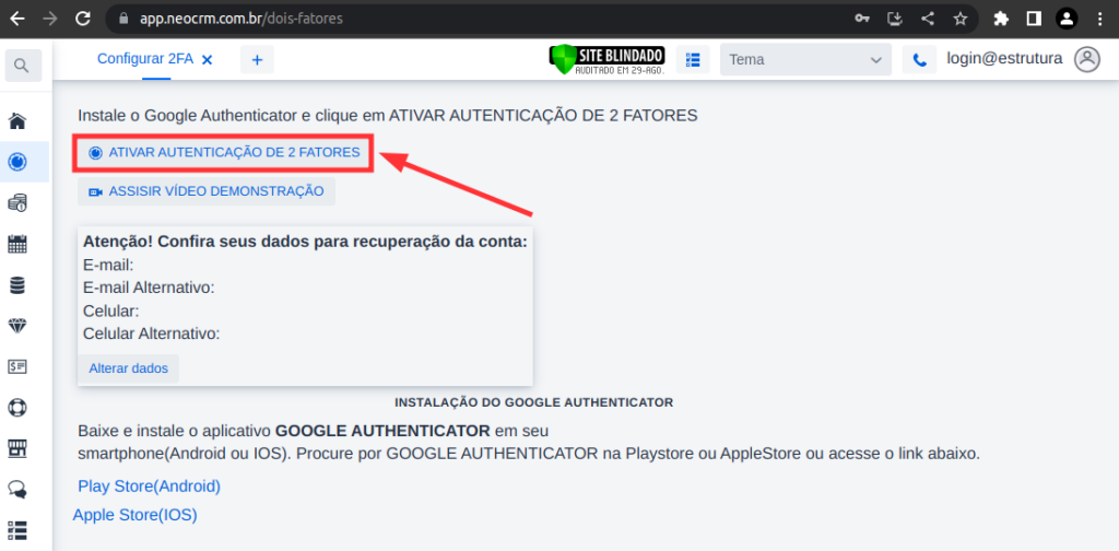 14 – Na sequência clique em ATIVAR AUTENTICAÇÃO DE 2 FATORES.