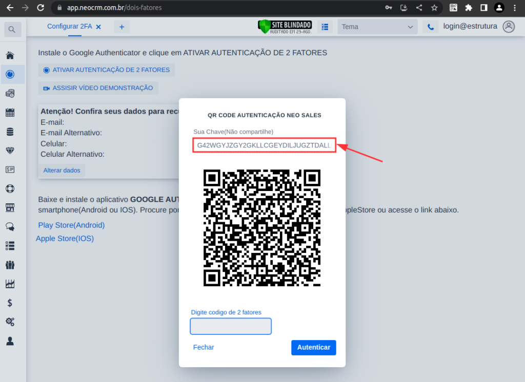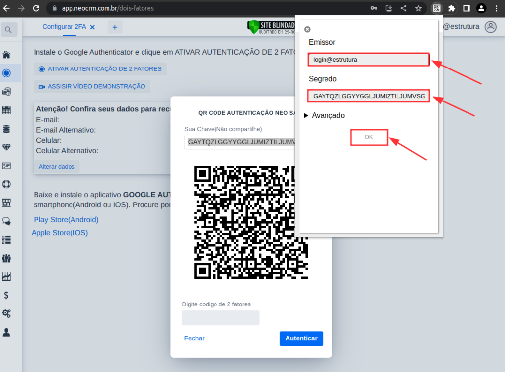 • Segredo: Cole aqui a chave copiada anteriormente.