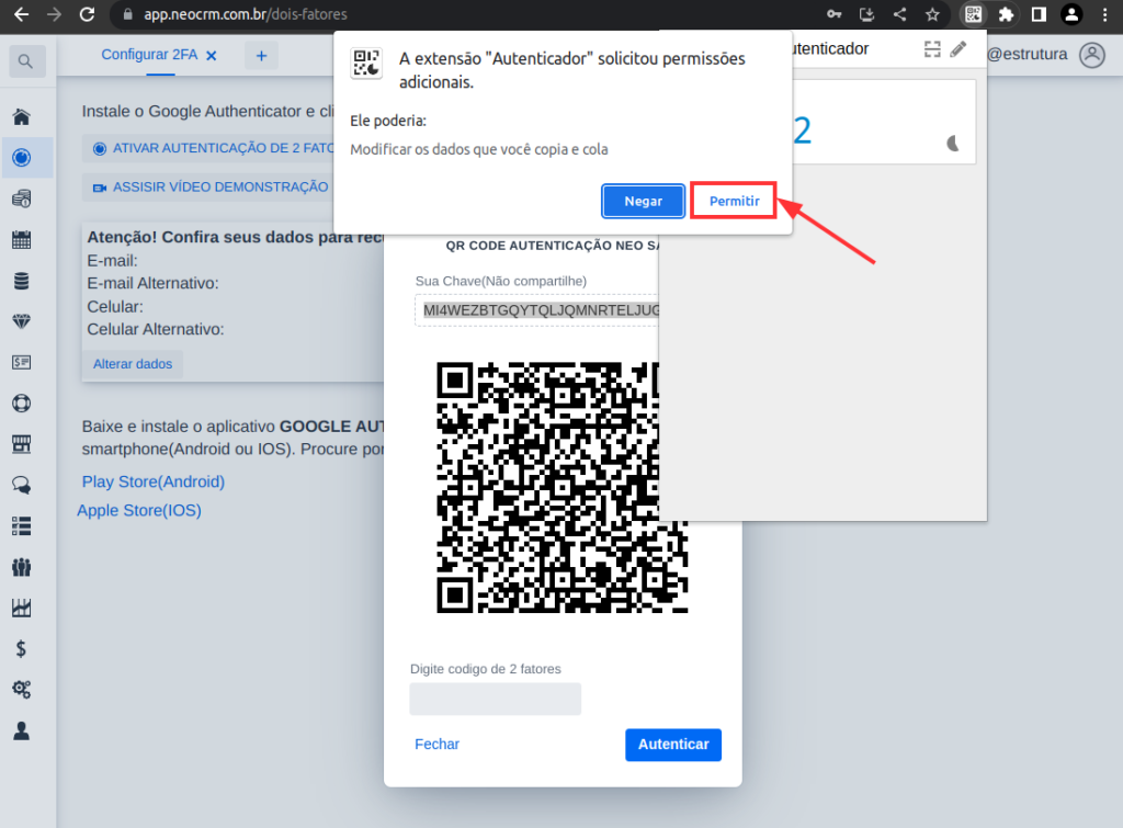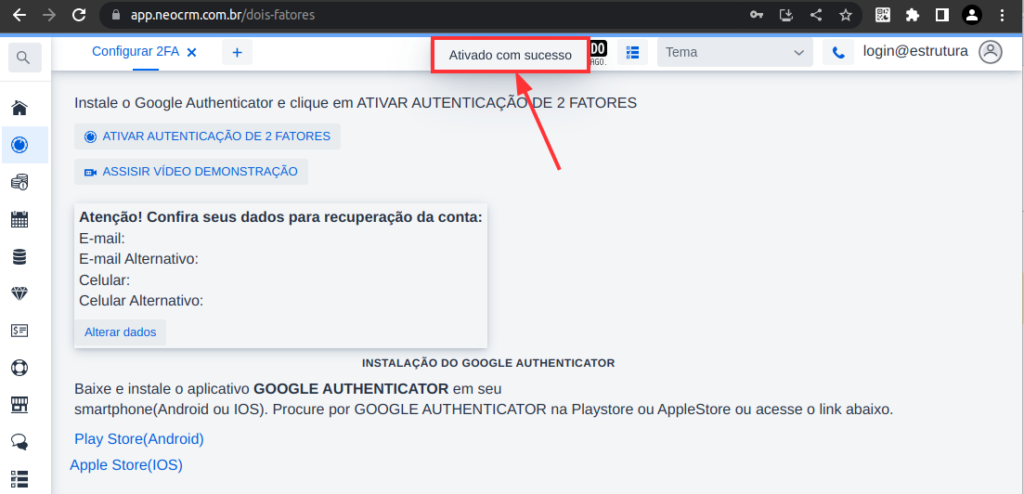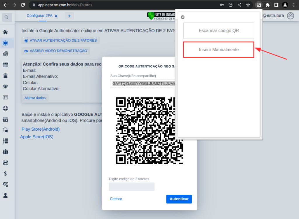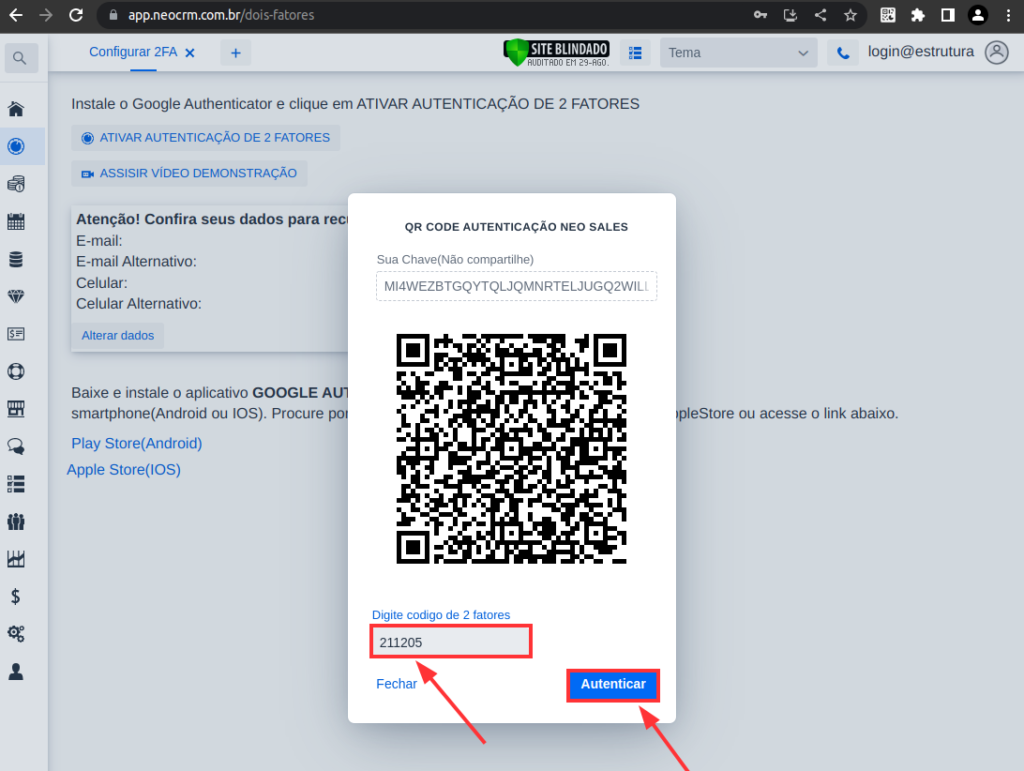 11 – Esta ação liberará o acesso ao NEO sem autenticação de 2Fatores por 10 minutos, suficientes para realizar a configuração.