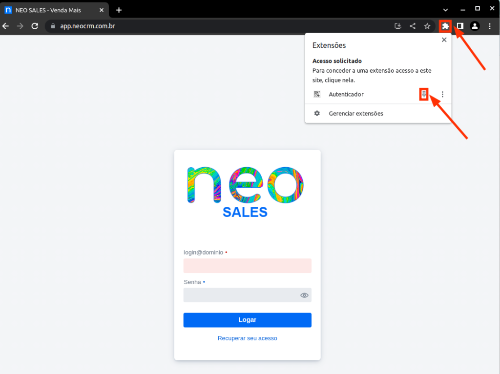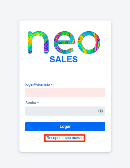 6 – Agora já no site do NEO SALES Clique em Recuperar seu Acesso.