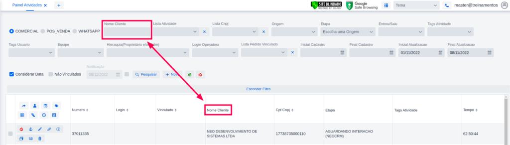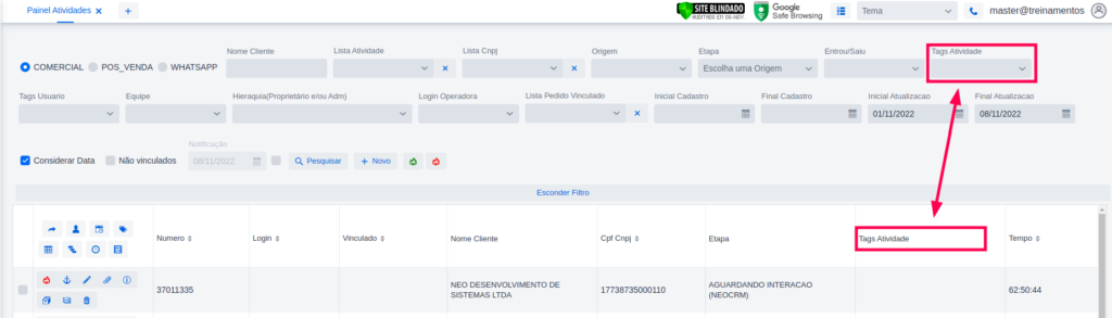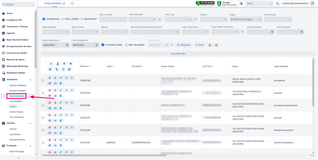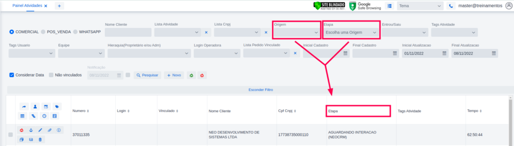 5 – Origem e Etapa: Pode-se filtrar apenas pela origem da atividade, se ela é uma atividade criada por um usuário é selelcionado a origem NEOCRM, caso for criado por alguma atualização via planilha, utiliza-se os outros tipos.