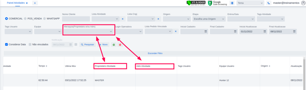 10 – Hierarquia(Proprietario e/ou Adm): Pesquisa pelo usuário selecionado.