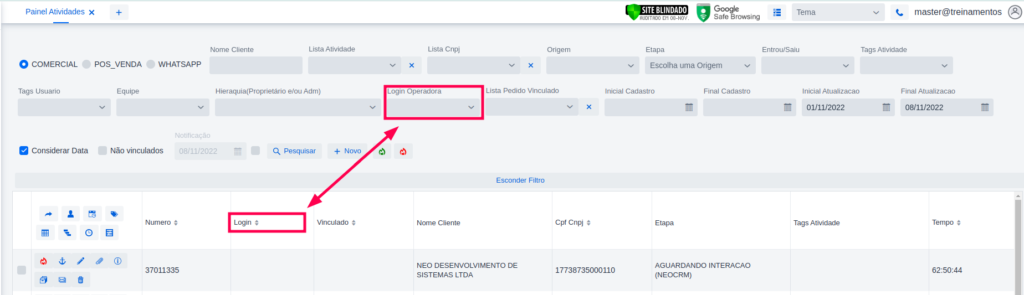 11 – Login Operadora: Pesquisa por todo o Login cadastrado, necessário realizar o vinculo nas atividades.