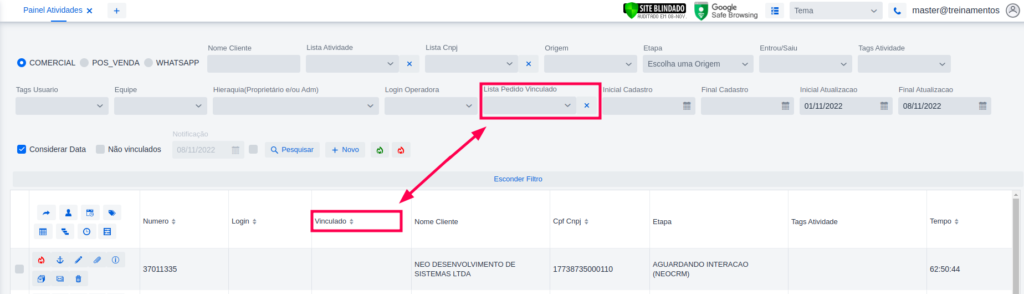 12 – Lista Pedido Vinculado: Pesquisa pelo número do pedido vinculado, necessário realizar o vinculo nas atividades.