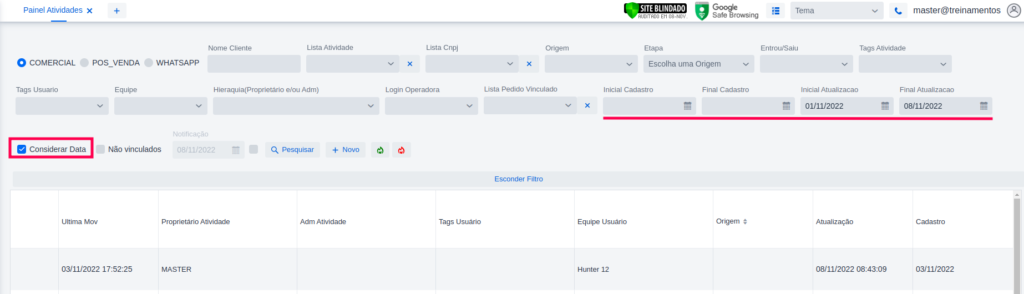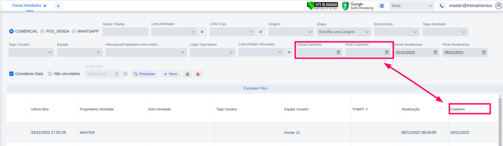 13 – Inicial Cadastro e Final Cadastro: Pesquisa pela data que a atividade foi criada.