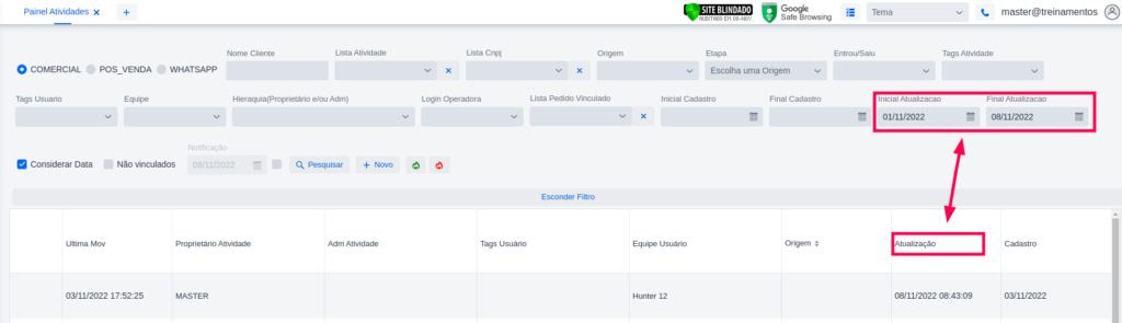 14 – Inicial Atualização e Final Atualização: Pesquisa pela data que foi realizada a última movimentação da atividade.