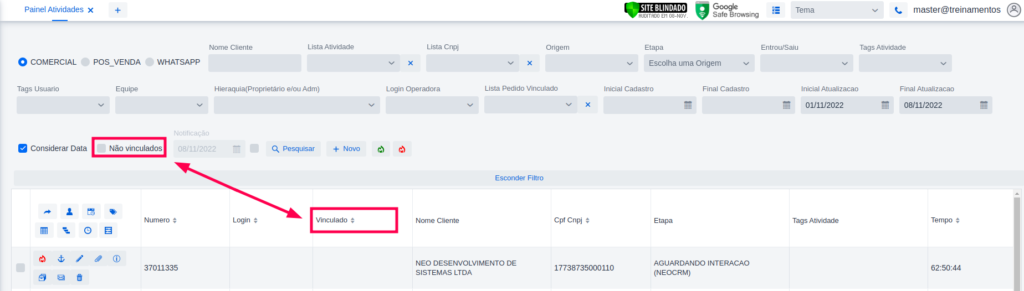 16 – Não Vinculados: Se estiver selecionado pesquisa somente pelas atividades que não foram vinculadas. Caso não esteja selecionado irá pesquisar por todas as atividades.