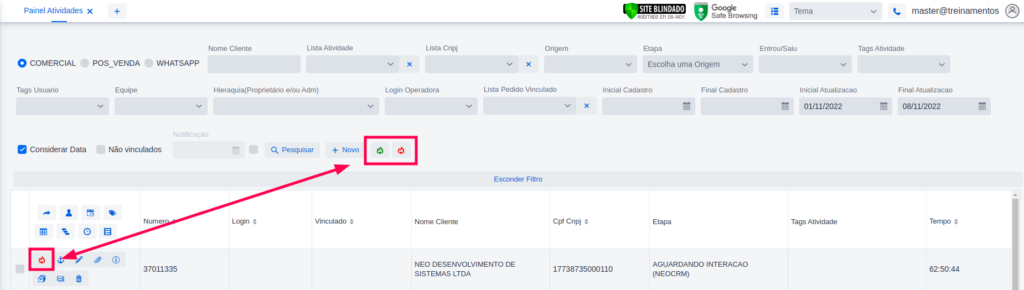 17 – SLA: Selecionando a chama verde, irá pesquisar por todas as atividades dentro do prazo de SLA. Selecionando a chama vermelha, irá pesquisar por todas as atividades fora do prazo de SLA.