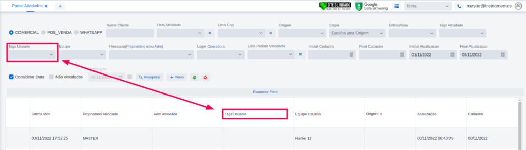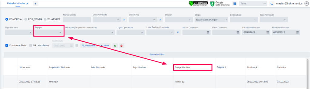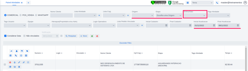 6 – Entrou/Saiu: Filtra as atividades que Entraram ou Sairam de acordo com outros filtros. Esse filtro é utilizado juntamente com outros filtros, um exemplo que podemos utilizar é, selecionamos ENTROU, uma ORIGEM, uma ETAPA e uma DATA INICIAL e DATA FINAL.
